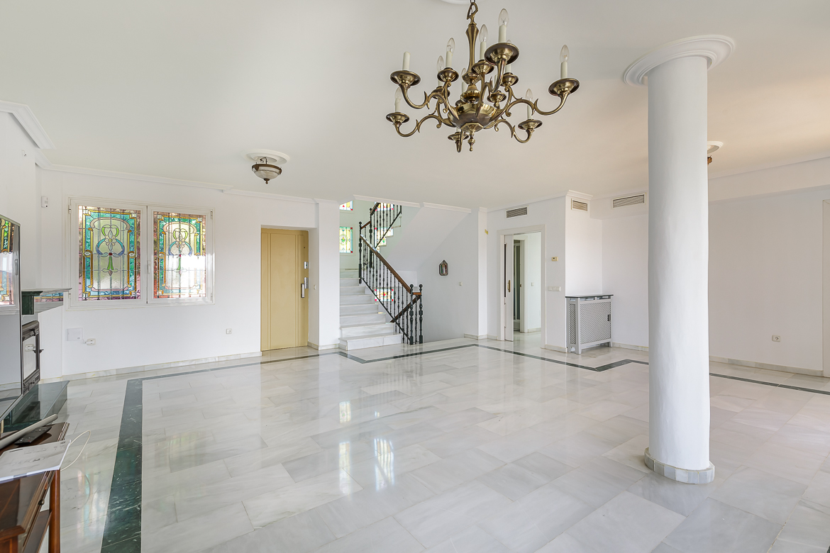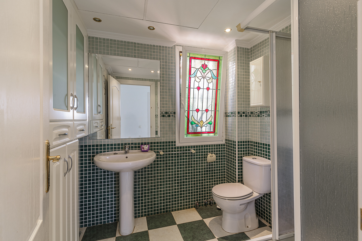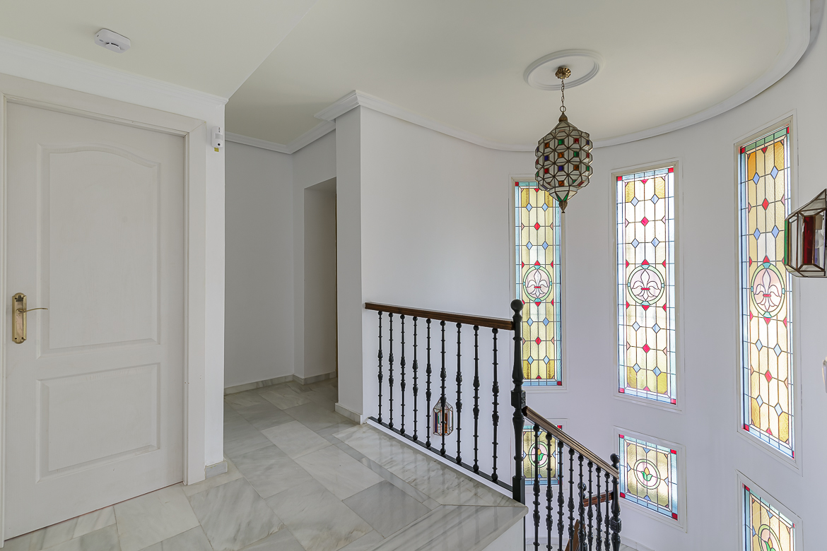 En el acceso a la vivienda encontramos un impactante recibidor donde se filtra la luz al interior a través de una espectacular vidriera de múltiples colores. La magia que genera la entrada a la casa, ya nos prepara para trasladarnos desde su amplio salón abierto y terraza, a través de los grandes ventanales, a apreciar y conectar con la vista de la urbanización y del campo de golf circundante. En esta planta se encuentra una cocina totalmente equipada desde la cual también puedes acceder a la terraza para disfrutar de desayunos gozando del benéfico clima de la Costa del Sol. Completa esta estancia, un amplio aseo.