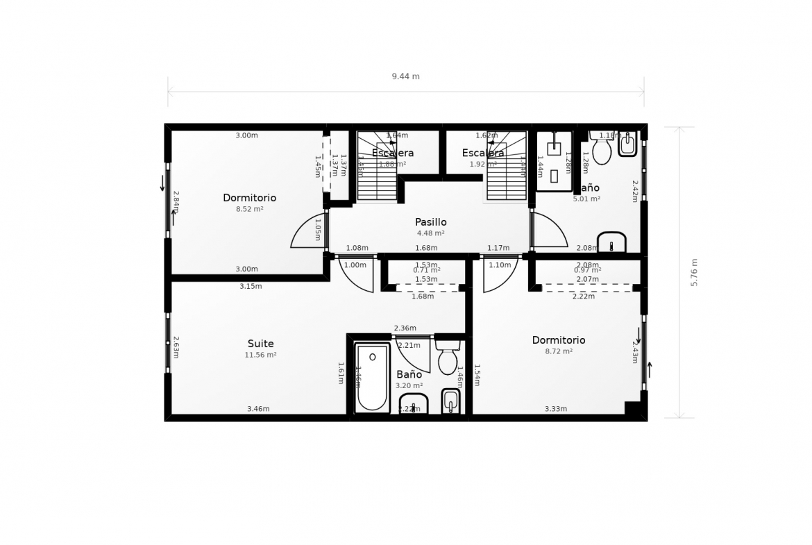 Planta Primera | El descanso privado: Tres dormitorios diseñados para el relax. Destaca la suite principal, un refugio de intimidad, complementada por un segundo baño exterior que aporta luz natural y ventilación.