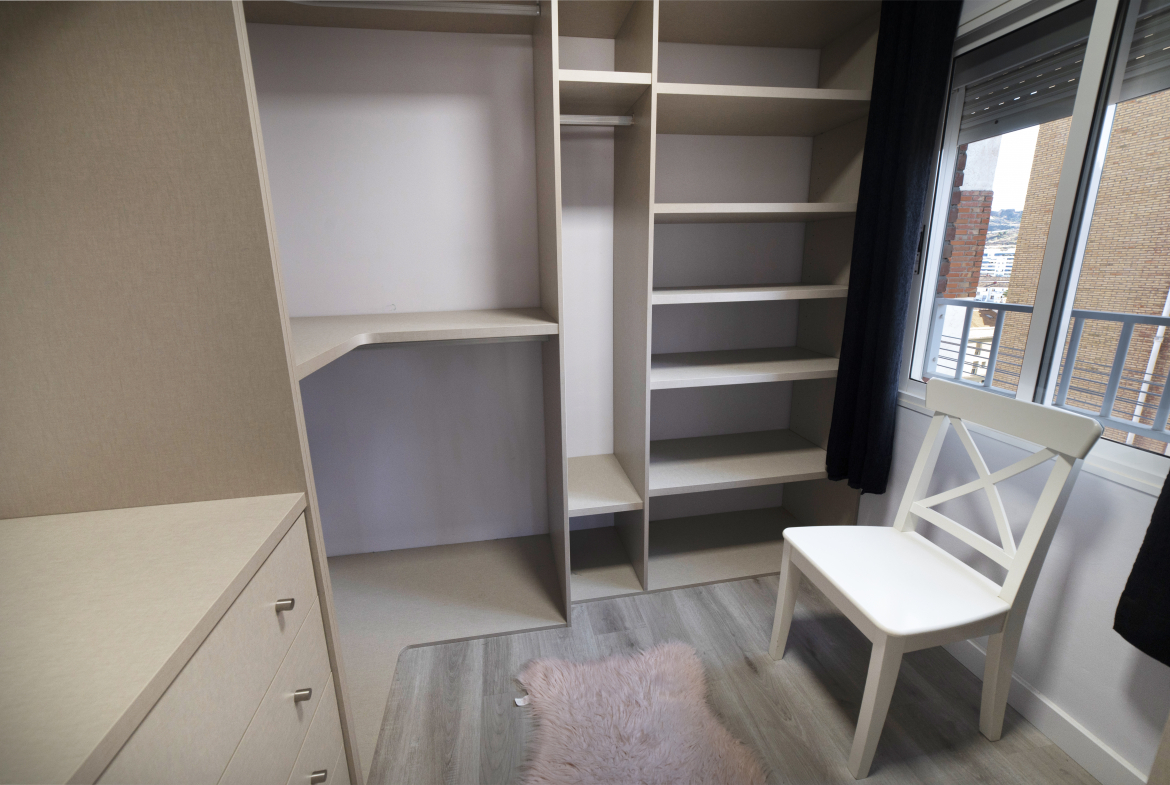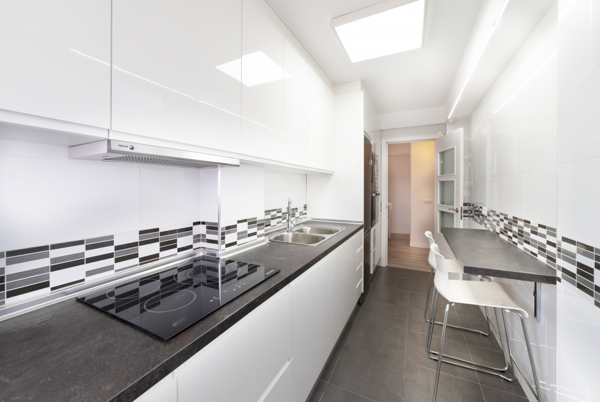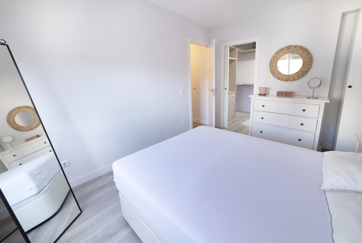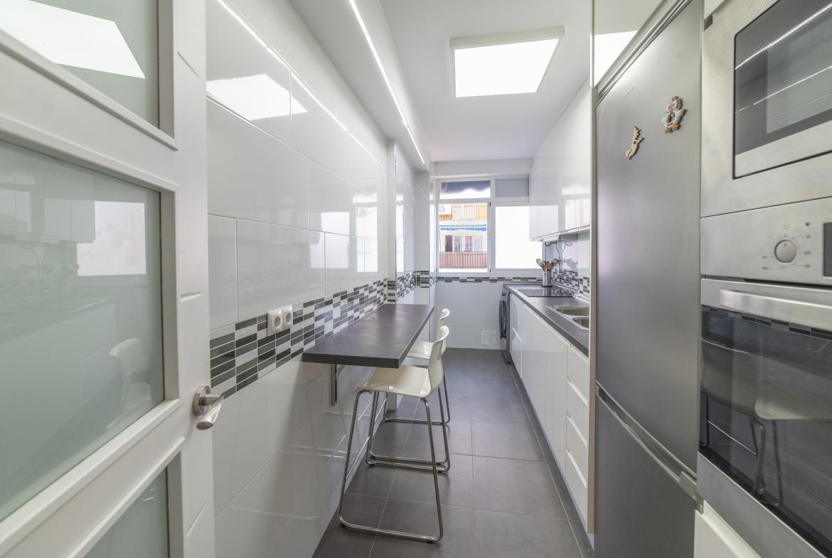El piso cuenta con una amplia cocina completamente equipada con barra y taburetes, ideal para comer o tomar un café. El lavadero integrado aporta luz y amplitud a la estancia. Dispone de dos habitaciones con canapé y armario, además de un baño completo y una tercera habitación convertida en un vestidor de ensueño con caja fuerte incorporada.