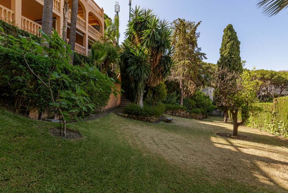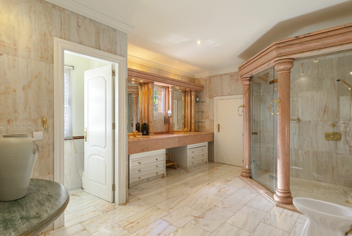 A través de una elegante escalera de mármol, accederás al segundo nivel, que cuenta con dos dormitorios con terrazas privadas y vistas al mar. También encontrarás dos baños espaciosos, uno de ellos en suite, y una amplia sala de juegos, salón de televisión y gimnasio. Al salir al jardín, accederás al tercer nivel, donde te espera un apartamento completamente independiente con un amplio dormitorio, baño y salón comedor con cocina. Todos estos espacios se conectan con otra amplia terraza que te invita a relajarte y disfrutar de la vida al aire libre. Además, la villa cuenta con una majestuosa piscina, una zona de barbacoa con cocina y baño, todo ello protegido por la privacidad de un magnífico jardín.